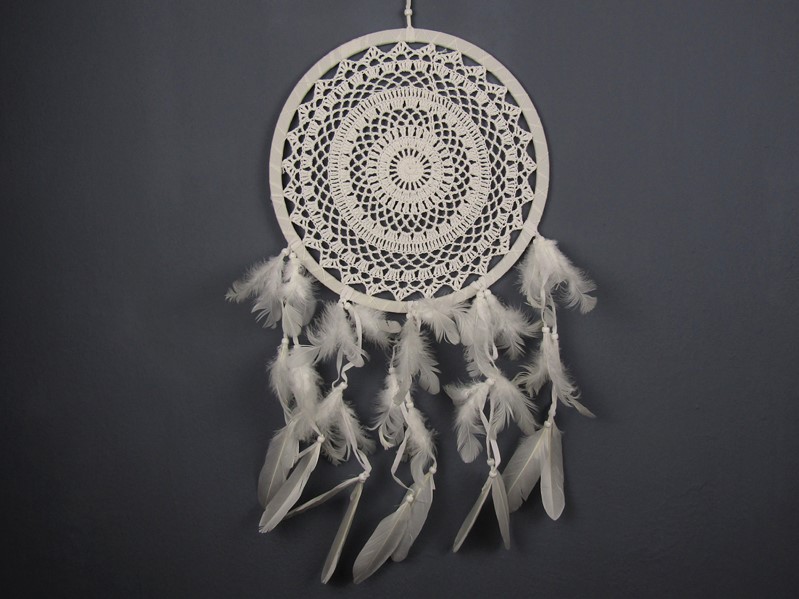 Větší lapač zlých snů byl vyroben v bílé barvě v Indonésii. Středový kruh lapačeje zhotoven háčkováním do kruhového provedení. Hlavní kruh lapače je omotán bílou kůží. Kespodní části lapače, kterou zakončují dlouhé světlé provázky z kůže, jsou napojeny malé bílé korálky s pěříčky v bílé barvě. V horní části lapače je provázek na zavěšení dekorace.