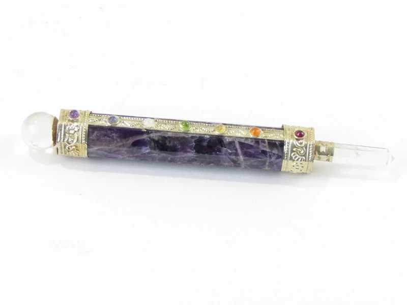 Léčitelská hůlka byla vyrobena v Indii z polodrahokamu ametyst. Celý kus kamene je ve válcovitém zpracování, s vybroušenými osmi plochami. Na jedné straně je válec ukončen tepaným zdobením z obecného bílé kovu, na jehož rovnou plochu je vsazen kulatý křišťál. Stranu druhou doplňuje rovněž tepané zakončení z kovu, kdy do kovového lůžka je umístěná křišťálová špice. Po celé délce válce vede tepaný pás z obecného bílého kovu, do kterého je vsazeno do kulatého lůžka 7 polodrahokamů v barvě sedmi čaker.