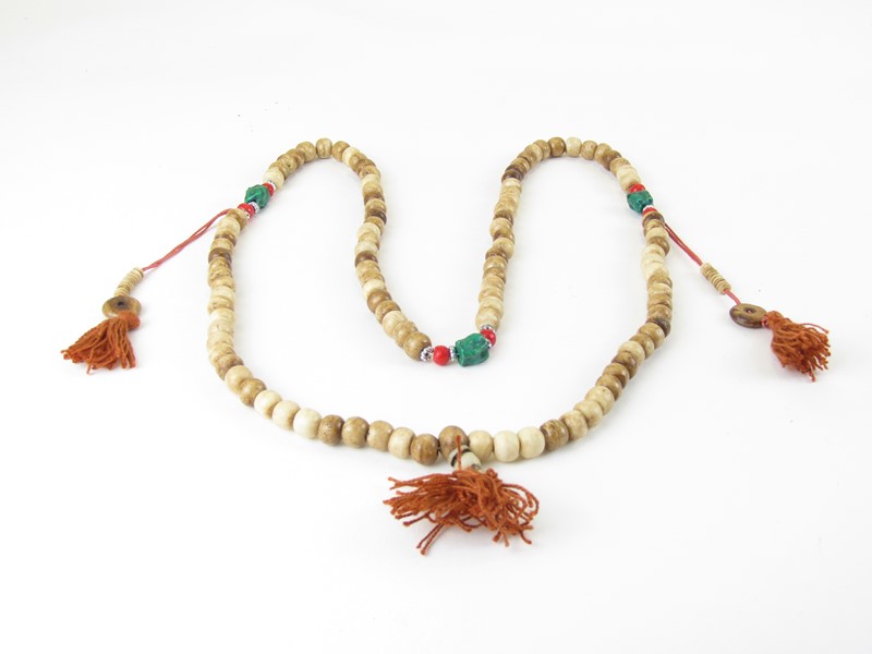 Mála znamená v překadu ze sanskrtu věnec nebo náhrdelník. Tyto modlitební korálky byly vyrobeny v Nepálu. Vyrobeny byly z kosti a jsou ve světle hnědé přírodní barvě. Celkový počet korálků je 108 plus 1 ukončovací - guru korálek. Mála je doplněna dalšími dvěmi rezavými šňůrkami po stranách, na které jsou navázány menší korálky a placatý korálek. Tyto dvě šňůrky a také guru korálek zakončuje střapeček z rezavé bavlny. Přírodní světlou málu zvýrazňují zelené, červené a kovové bílé korálky. Mála je podobná funkcí s naším růžencem.