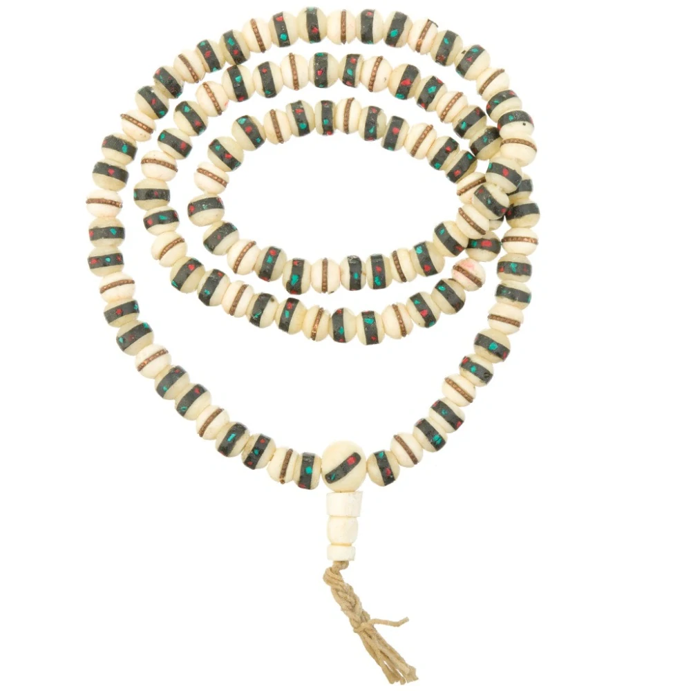 Mála znamená v překladu ze sanskrtu věnec nebo náhrdelník. Tyto modlitební korálky byly vyrobeny v Nepálu. Vyrobeny byly z barvené kosti a jsou v přírodní bílé barvě. Korálky jsou zdobené vloženým měděným kroužkem a drtí z polodrahokamů. Celkový počet korálků je 108 plus 1 ukončovací - guru korálek. Navlečené jsou na bílé bavlně. Ukončovací korálek je doplněn bílým bavlněným střapečkem. Mála je podobná funkcí s naším růžencem.