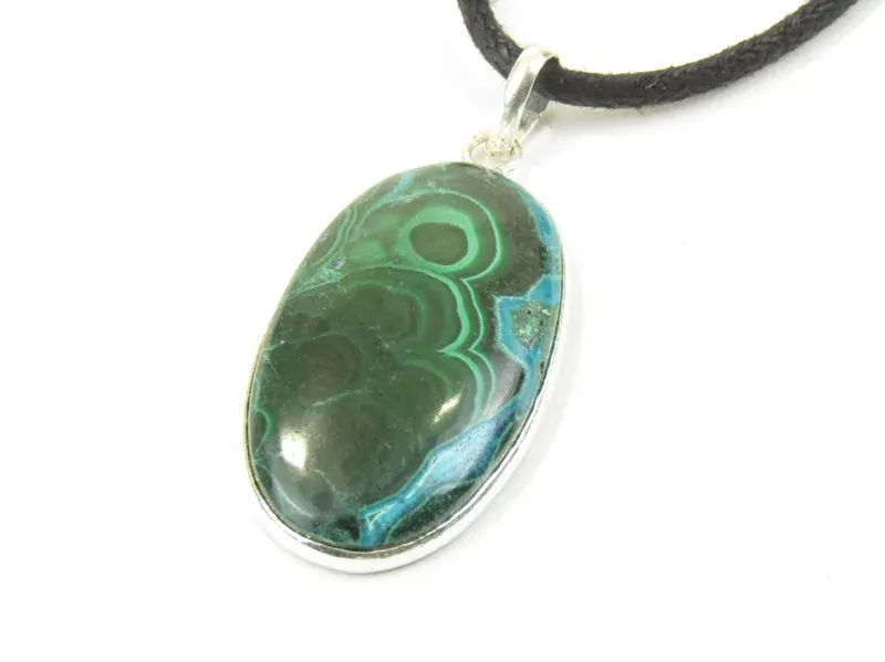 Krásně barevný polodrahokam malachit s chryzokolem, ve tvaru oválu, je vsazen do bílého obecného kovu. Kov lemuje obvod kamene a horní část je doplněna očkem na protažení bavlnky. Bavlnka je součástí přívěšku. Bavlnka je kulatá, barvy černé a zavazuje se na uzlík.