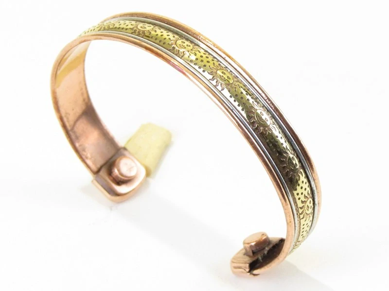 Náramek z Indie je vyroben z mosazi, mědi a bílého obecného kovu. Horní strana náramku je krásně zdobená sluníčky a tepáním z bílého kovu, mosazi a mědi. Spodní strana je hladká, měděná. Z každé strany náramku je na spodní straně připevněn magnet.