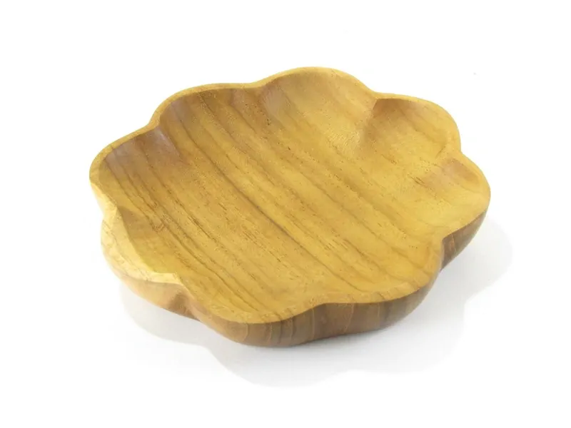 Z teakového světlého dřeva byla v Indonésii vyrobena miska ve tvaru květu. Krásně vysoustružená miska má jeden prostor na nasypání oříšků nebo menších sušených plodů. Po celém obvodu kruhu má miska obloučkové zdobení.