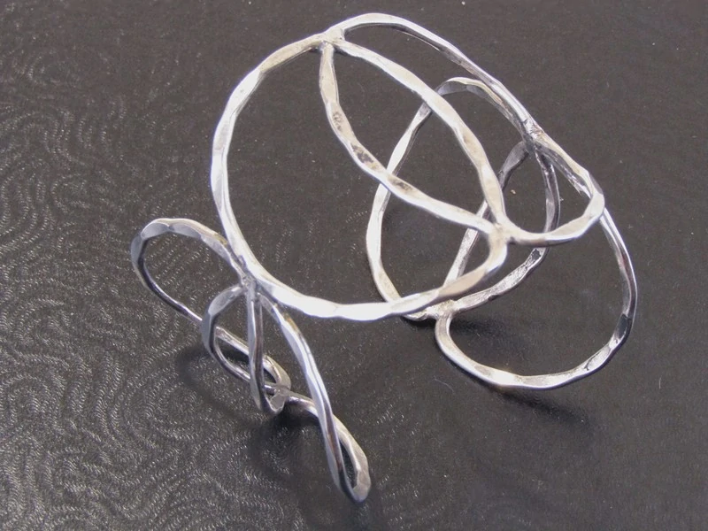 Moderní náramek byl vyroben z obecného bílého kovu v Indii. Horní část zdobí oválné tvary přes sebe, které jsou jemně tepané.Náramek má otevřený tvar.