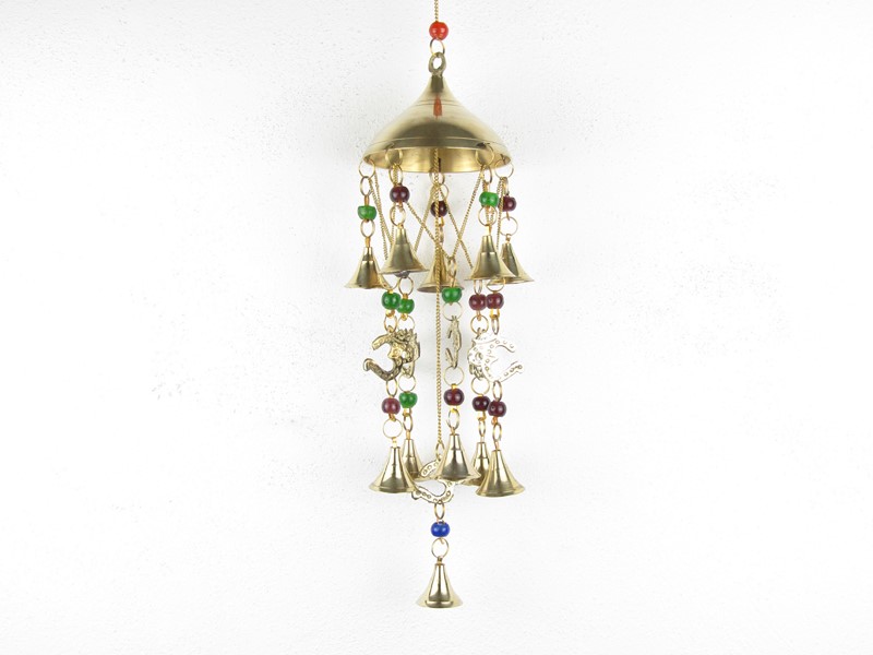 Krásná mosazná zvonkohra s budhistickým symbolem ÓM a zvonečky byla vyrobena v Indii. Šest ÓM, lehce tepaných, doplňuje spousta hladkých mosazných zvonků. Kovové řetízky, které spojují ÓM a zvonky, barevně doplňují pestré skleněné korálky. ÓM a zvonky jsou řetízky a kroužky připevněni k horní mosazné polokouli do špičky, která dále pokračuje řetízkem s korálkem na zavěšení.