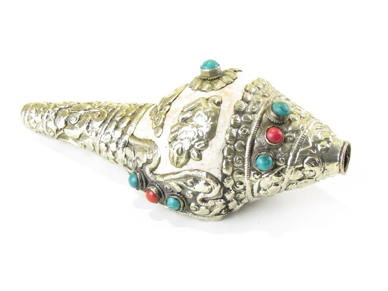 Velká mušle, ručně vyrobená v Nepálu, je jedním ze symbolů boha Višnua a jedním z osmi posvátných buddhistických symbolů, přinášejících štěstí a osvícení. Vyrobena byla z ulity mořského měkýše. Bohatě dozdobena je bílým krásně tepaným, obecným kovem. Motiv zdobení jsou květy a zvířata. Na zúženém konci mušle je vsazen zelenomodrý korálek. Červené a zelenomodrémodré korálky zdobí i plochu mušle. Druhý konec je dutý.