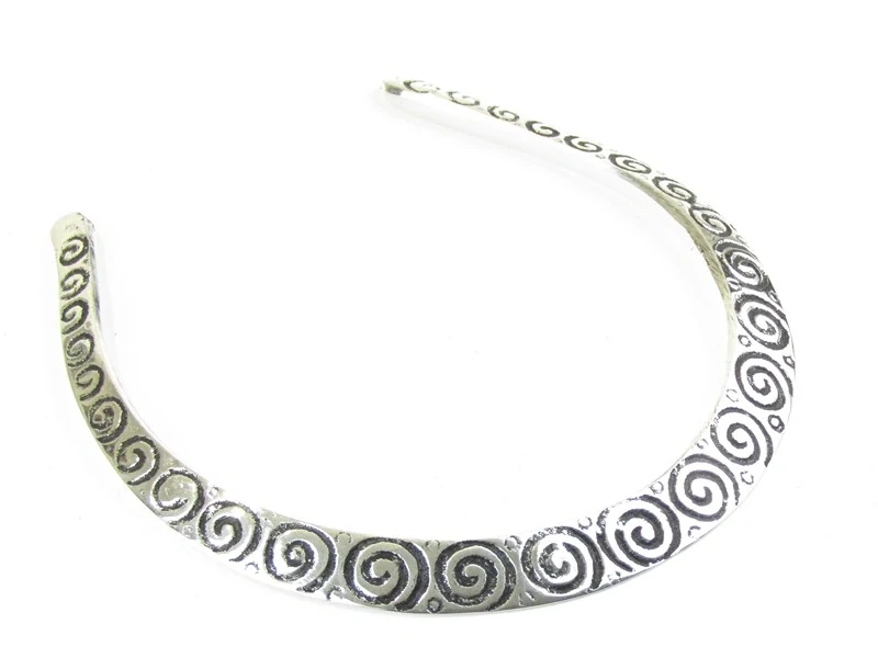 Krásný, otevřený náhrdelník byl vyroben v Indii, z obecného bílého kovu. Náhrdelník je ve středové části širší a směrem ke krku se zužuje. Přední strana je zdobená spirálkami. Zadní strana je hladká, bílá. Na krk se nasazuje ze předu. Pěkně drží a nepadá.