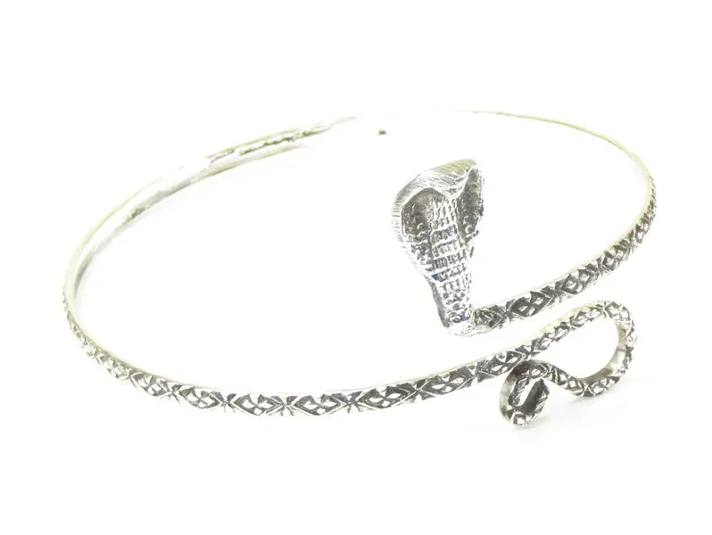 Pěkné ruční zpracování náramku na paži v Indii okouzlí motivem hada ve středu náramku. Náramek je vyroben ve větší velikosti a ozdobí Vaši paži. Náramek je vyroben z obecného bílého kovu, který je jemně tepaný. Velikost, díky otevřenému tvaru, lze přizpůsobit.