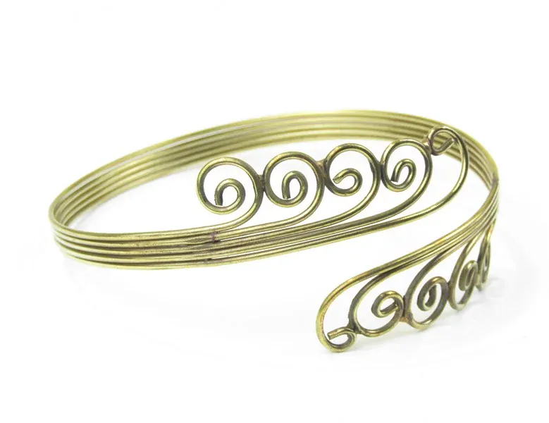 Pěkné ruční zpracování náramku na paži z Indie s motivem mnoha spirálek ve středu náramku. Spodní část je tvořená z pěti tenkých náramků. Náramek je vyroben ve větší velikosti a ozdobí Vaši paži. Náramek je vyroben z obecného žlutého kovu. Velikost, díky otevřenému tvaru, lze přizpůsobit.