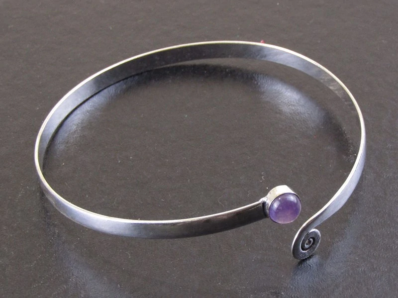 Pěkné zpracování náramku na paži v Indii se spirálkou a polodrahokamem ametystem. Kámen je kulatého tvaru a vsazen je do lůžka, které zdobí jednu stranu. Na druhém konci náramku je malá kovová spirálka. Náramek je vyroben ve větší velikosti a ozdobí Vaši paži. Náramek byl vyrobený z obecného bílého kovu. Velikost, díky otevřenému tvaru, lze přizpůsobit.