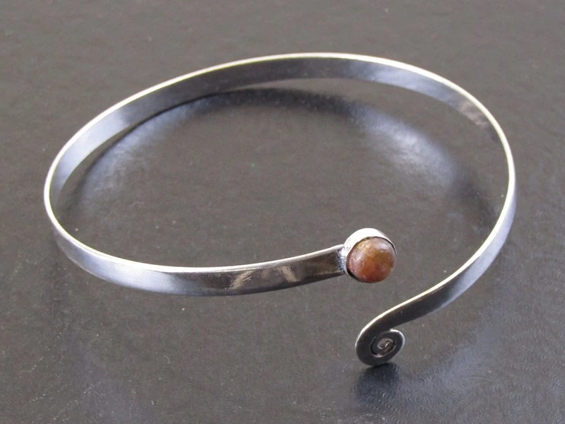Pěkné zpracování náramku na paži v Indii se spirálkou a polodrahokamem tygří oko. Kámen je kulatého tvaru a vsazen je do lůžka, které zdobí jednu stranu. Na druhém konci náramku je malá kovová spirálka. Náramek je vyroben ve větší velikosti a ozdobí Vaši paži. Náramek byl vyrobený z obecného bílého kovu. Velikost, díky otevřenému tvaru, lze přizpůsobit.