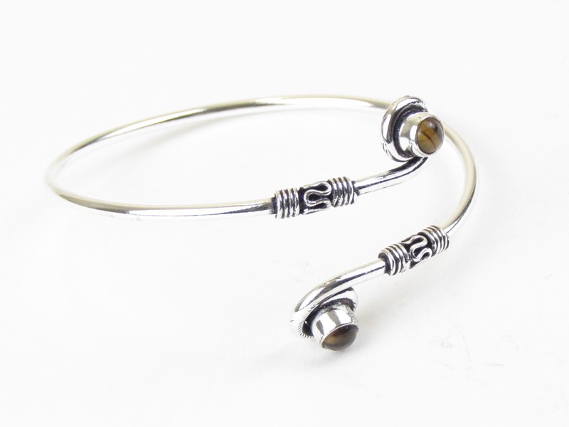 Jemné zpracování náramku z Indie Vás zaujme svým jemným zpracováním a zdobením.Nad sebou jsou dvě zatočené spirálky, do kterých jsou vsazeny malinké kulaté polodrahokamy tygří oka. Náramek je vyroben z obecného bílého kovu. Velikost, díky otevřenému tvaru, lze přizpůsobit.