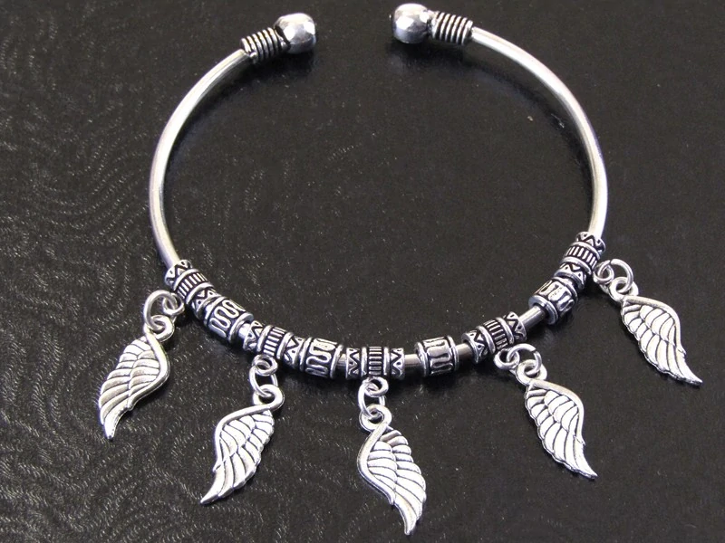 Náramek byl vyroben z obecného bílého kovu v Indii. Velikost, díky otevřenému tvaru, lze mírně přizpůsobit. Otevřený kulatý tvar náramku na každém konci zakončují kovové kuličky. Obvod náramku je doplněn zdobenými kroužky a pěti kroužky s připevněnými andělskými křídly.