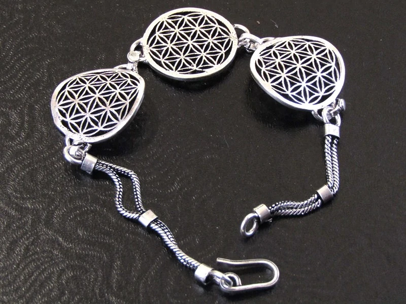 Náramek byl vyroben z obecného bílého kovu v Indii. Skládá se ze tří kulatých částí, zdobených lotosovým květem, které jsou k sobě spojeny kroužky. Prostřední lotosový květ je placatý a boční jsou mírně vypouklé. Na poslední kulaté části jsou napojeny kroužky se dvěmi řetízky. Zapínání je na esíčko.