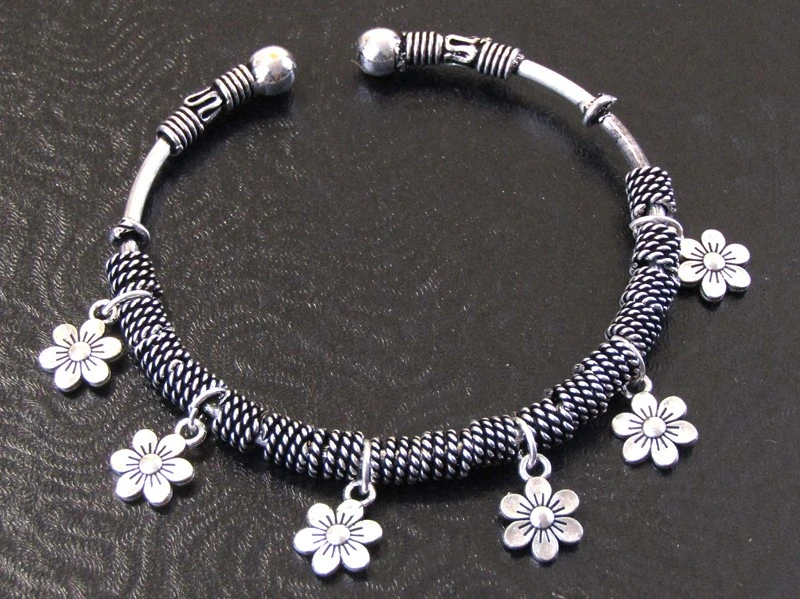 Náramek byl vyroben z obecného bílého kovu v Indii. Velikost, díky otevřenému tvaru, lze mírně přizpůsobit. Otevřený kulatý tvar náramku na každém konci zakončují kovové kuličky. Obvod náramku je doplněn zdobenými kroužky a šesti kroužky s připevněnými kytičkami.