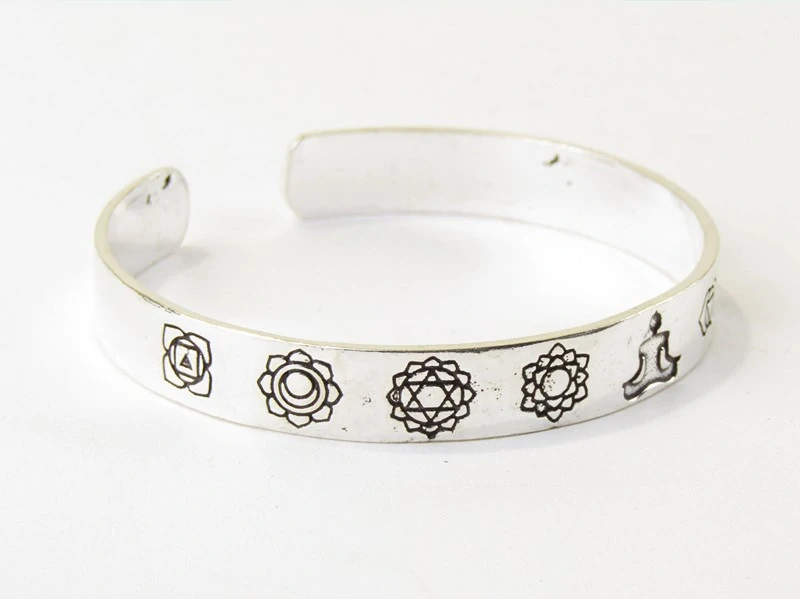 Pevný náramek byl vyroben z obecného bílého kovu v Indii. Velikost, díky otevřenému tvaru, lze přizpůsobit. Spodní strana náramku je hladká. Horní část zdobí jemné tepání symbolů a Buddhy.