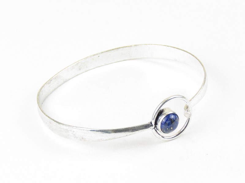 Jemné zpracování náramku z Indie zaujme svým hladkým provedením a tvarem.Z jedné strany je vsazen do kulatého lůžka lapis lazuli, který je na kraji kruhu a ze strany druhé je zobáček, který slouží k zapínání náramku o kruh. Náramek je vyroben z obecného bílého kovu.