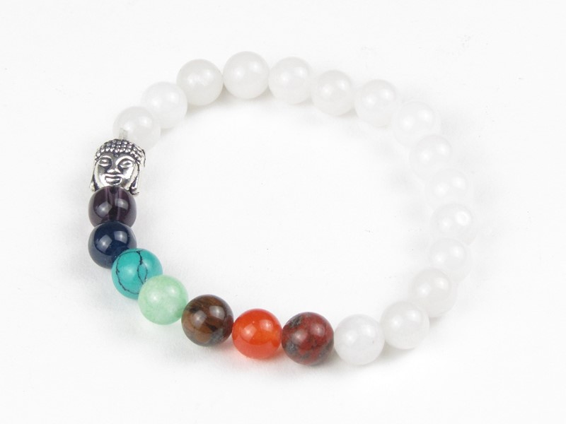 Pěkný náramek z polodrahokamu křišťál byl vyrobený v Indii. Jednotlivé méně čiré, bílé kulaté korálky křišťálu jsou doplněny sedmi barevnými korálky z polodrahokamu dle čaker a kovovou hlavou Buddhy.