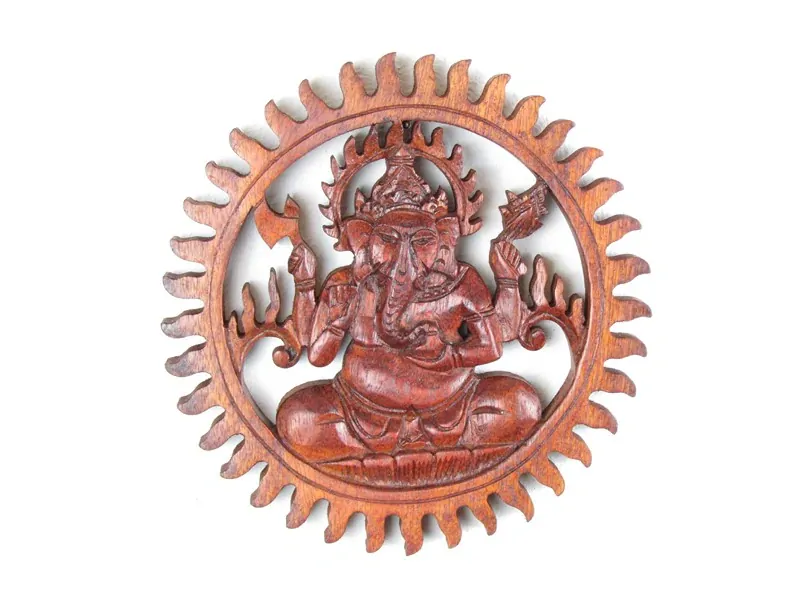 Pěkná nástěnná dekorace sedícího hinduistického boha Ganéše v meditační poloze. Ganéš byl ručně vyřezaný z tropického hnědého dřeva v Indonésii do kruhu, který po obvodu zdobí paprsky. Po obou stranách Ganéše jsou vyřezány listy. Vzadu je vyřezána sekerka. Místy je Ganéš zdoben jemnou řezbou. Ruce jsou čtyři a v každé z nich drží Ganéš svůj atribut. Sedí v meditačním posedu na lotosovém květu.