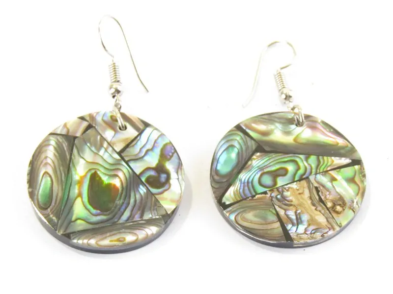 Krásné náušnice tvaru kruhuz Indonésie byly vyrobené z černé epoxidové pryskyřice a pauy. Celá přední strana je vyplněná krásně barevnými kousky z pauy. Zadní strana je černá, hladká.