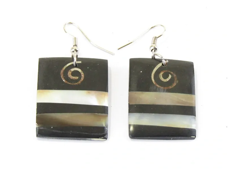 Krásné náušnice ve tvaru obdélníku z Indonésie, které byly zhotovené z černé epoxidové pryskyřice a mušloviny. V horní části náušnic je vsazená spirálka. Pod spirálkou, směrem dolů, jsou pruhy z bílé a světle hnědé mušloviny. Zadní strana je černá, hladká.