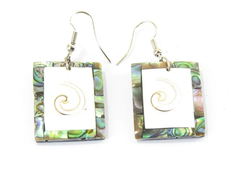 Krásné náušnice ve tvaru obdélníku z Indonésie, které byly zhotovené z černé epoxidové pryskyřice, pauy a mušloviny. Ve středu náušnic je vsazená spirálka z bílé mušloviny. Spirálka je vsazená do světlého podkladu z mušloviny. Obvod obdélníku je lemovaný modrozelenou pauou. Zadní strana je černá, hladká.