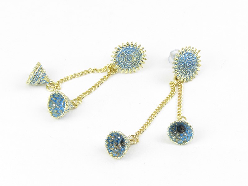 Kovové náušnice jsou vyrobeny z lehkého žlutého obecného kovu. Na horní kulatý díl jsou napojeny dva řetízky různé délky. Řetízky zakončují malé zvonečky. Barva je bleděmodrá. Na zadní straně kolečka je tyčinka s pryží na zapínání. Styl náušnic je visací.