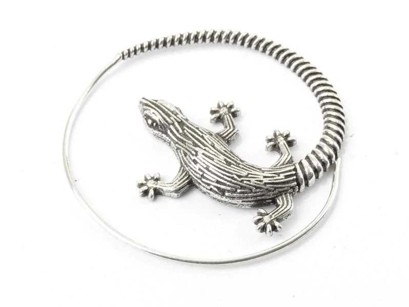 Velká náušnice z bílého obecného kovu byla vyrobená v Indii. Tvar náušnice je stočený kruh s ještěrkou.
