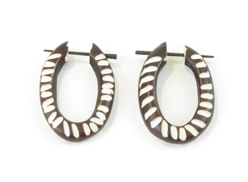 Náušnice (pár) byly ručně vyrobené v Indii z polymeru. Mají tvar oválný. Tmavě hnědý ovál je z obou stran vyřezávaný. Řezba má barvu bílou. Zapínaní je na dřevěnou černou tyčinku.