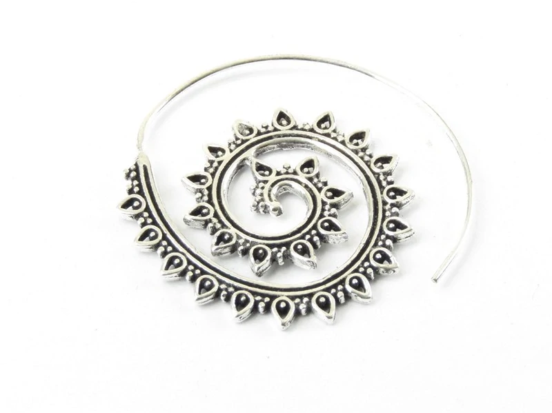 Velká náušnice z bílého obecného kovu byla vyrobená v Indii. Tvar náušnice je stočená spirála, pěkně zdobená.