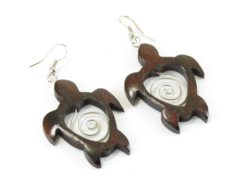 Dřevěné náušnice byly ručně vyrobeny z exotického dřeva v Indonésii. Tvar náušnic je želva, kdy ve středu náušnic je vsazena spirálka z obecného bílého kovu. Barva dřeva tvaru želvy je tmavší hnědá a v kombinaci s kovemvytváří elegantní vzhled náušnic.