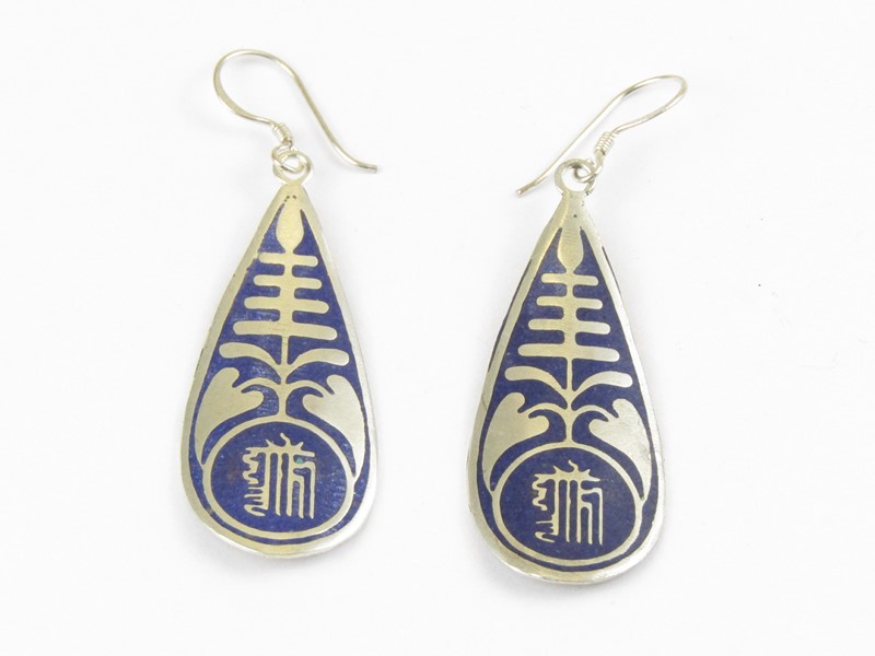 Delší náušnice ve tvaru kapky jsou vykládané drtí kamenů v barvě lapisu lazuli. Vyrobené jsou z bílého obecného kovu. Tvar kapky je lehce prohnutý. Vykládaná plocha drtě kamenů je jemně zdobená bílou intarsií symbolu ÓM a lístků.Zadní strana náušnic je bílá, hladká. Háčky náušnic jsou z bílého obecného kovu.
