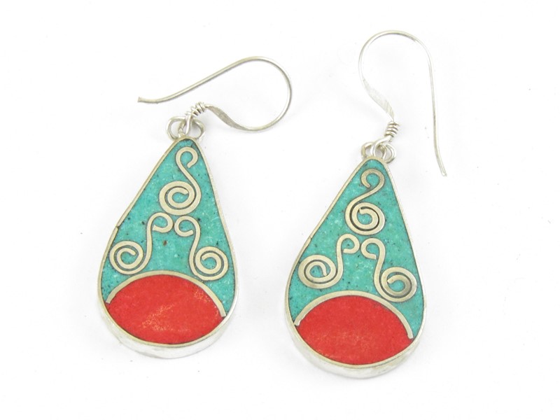 Stylové náušnice ve tvaru kapky jsou vykládané drtí kamenů v barvě červeného korálu a tyrkysu. Vyrobené jsou z bílého obecného kovu. Vykládaná plocha drtě kamenů je jemně zdobená intarsií spirálek z bílého kovu.Zadní strana náušnic je bílá, hladká. Háčky náušnic jsou z bílého obecného kovu.