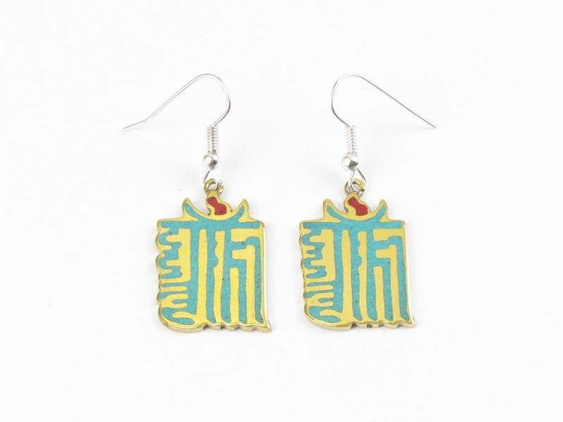 Náušnice z Nepálu jsou vyrobené v obdélníkovém tvaru. Jsou vykládané drtí kamenů v barvě tibetského tyrkysu. V drti kamenů je vložen z mosazi buddhistický symbol ÓM, napsaný v nepálštině. Znak je nahoře doplněn malou tečkou v barvě červeného korálu. Vyrobené byly velice kvalitně z mosazi. Zadní strana je žlutá, mosazná. Háčky náušnic jsou z bílého obecného kovu.