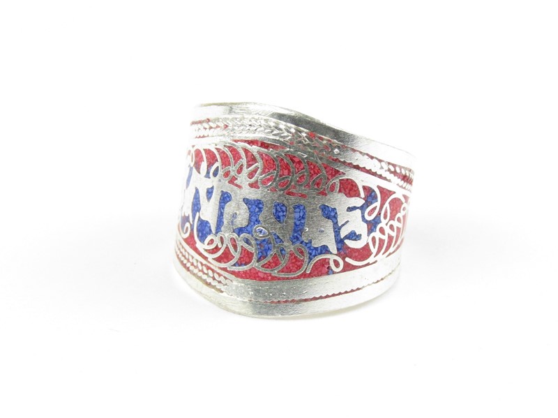 Krásný prstýnek byl vyroben v Nepáluz obecného bílého kovu. Uprostřed prstenu je zobrazena mantra na modrém podkladě. Celá horní plocha prstenu je jemně tepaná a doplněná barvou červenou. Spodní strana je hladká, bílá.