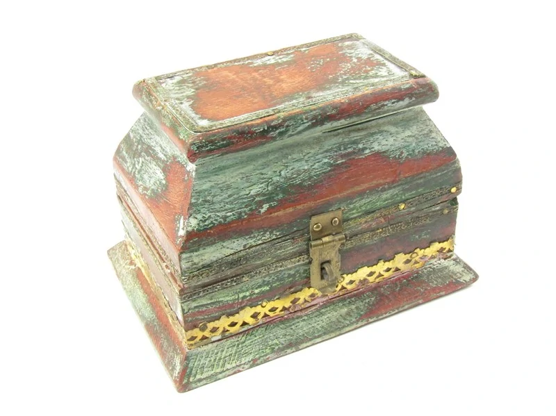 Pěkná dřevěná truhlička, stylu vintage, byla vyrobena v Indii. Horní víko je otevírací. Víko je ze zadní strany přichyceno na kovové malé panty. Truhlička je v podkladové barvě hnědé, kdy prosvítá barva zelená. Krásně je dozdobená kovovými tepanými plátky a mosazným zavíracím pantem. Spodní i vnitřní strana krabičky má barvu hnědou.