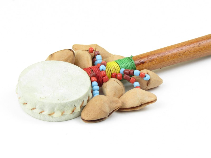 Na dlouhé dřevěné držadlo je připevněn oboustranný kruh, který je potažený kozí kůží. Uvnitř malého bubínku z kůže jsou korálky, které při pohybu bubínkem chrastí. Plocha kůže je z každé strany hladká, přírodní. Po stranách držadla jsou přivázány šňůrky s barevnými korálky, které zakončují skořápky ořechů. Ty při otáčivém pohybu zleva doprava dělají rachotivý zvuk.