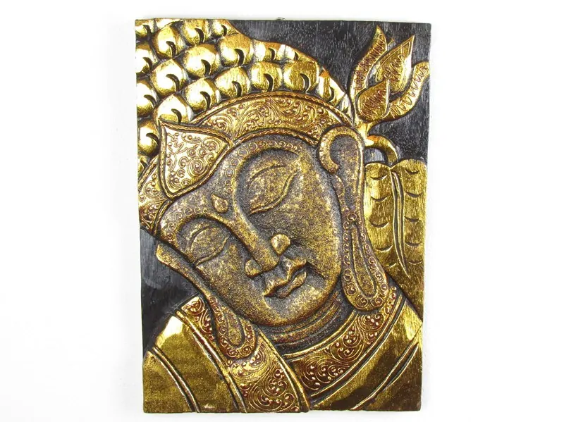 Obraz s hlavou Buddhy byl ručně vyroben v Indonésii. Barva plastiky je černá. Černá barva je doplněna barvou zlatou. Oči má Buddha přivřené. Ústa se zlehka usmívají. Celá řezba hlavy Buddhy je krásně jemně zdobená ornamentální řezbou. Zadní strana je hladká, černá, s háčkem na zavěšení.