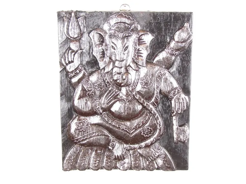 Obraz s hinduistickým bohem Ganéšou byl ručně vyroben v Indonésii ze dřeva. Barva obrazu je černá. Černou plochu obrázku vyplňuje Ganéš v barvě stříbrné. Postava Ganéše je krásně zdobená plastickým malováním a řezbou. Ze zadní strany je obraz hladký, černý. Na horní zadní straně je připevněn háček na zavěšení dekorace.