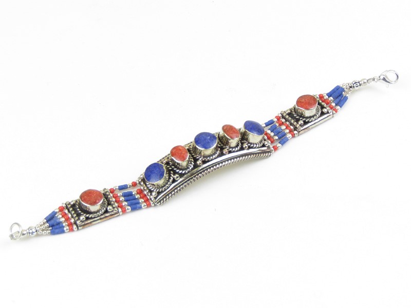 Krásný, bohatě zdobený náramek, byl vyroben v Nepálu, podle inspirace tibetských šperků. Bílý obecný kov je vykládaný červeným korálem a lapisem lazuli. Jednotlivé kovové díly spojují červené, modré a kovové korálky, které jsou navlečeny na kovou tenkou strunu.