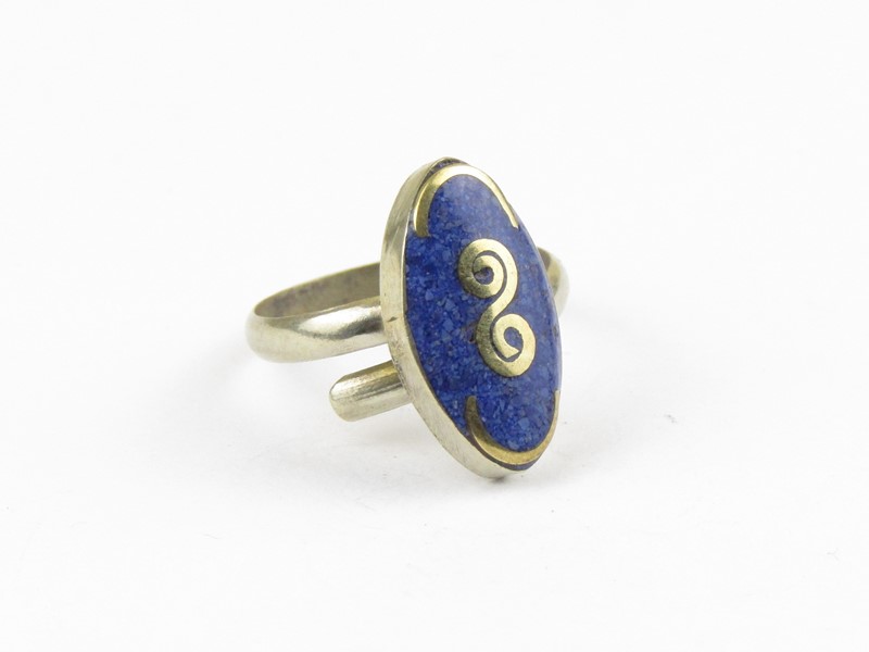 Prstýnek byl vyroben v Nepáluz bílého obecného kovu. Horní stranu prstýnku zdobí tvar oválu, který je vykládaný drtí kamenů v barvě lapisu lazuli. Ve středu oválu je mosazná intarsie v podobě spirálky.Tenký kroužek prstenu je hladký, nezdobený a lze, v horní části prstenu, posunutím nastavit dle velikosti Vašeho prstu.