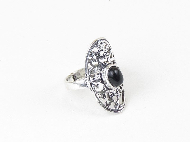 Krásný větší prstýnek byl vyroben v Indiiz obecného bílého kovu. Horní stranu prstýnku zdobí větší tvar oválu, do kterého je vsazen oválný polodrahokam černý turmalín. Spodní část je hladkánastavovací.