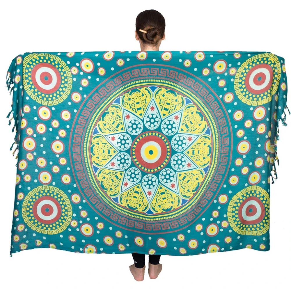 Origininální šál, jehož popularita a obliba stále vzrůstá, byl vyroben v Indii z velice jemného a na dotek příjemného rayonu. Barva sárongu je zelená. Plochu látky zdobí barevný tisk s motivem nazaru - tureckého oka. Spodní část šálu doplňují střapce.