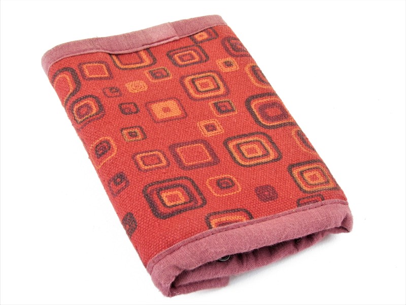 Krásná a praktická peněženka byla vyrobena v Nepálu z červené bavlny. Červená látka má potisk ve tvaru čtverců a obdélníků, které jsou v barvě světle oranžové a černé. Peněženka je olemována tmavší červenou bavlnou. Suchý zip a dva zipy jsou v barvě černé.