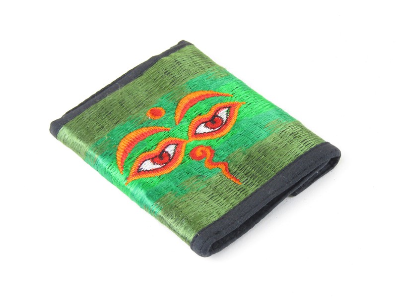 Krásná a praktická peněženka byla vyrobena v Nepálu z černé bavlny. Přední a zadní strana peněženky je vyšívaná viskózou. Barvy jsou laděny do tónu zelené, kdy uprostřed je centrálním motivem symbol Buddhových očí. Buddhovy oči jsou vyšity červenou, bílou, černou a oranžovou barvou.