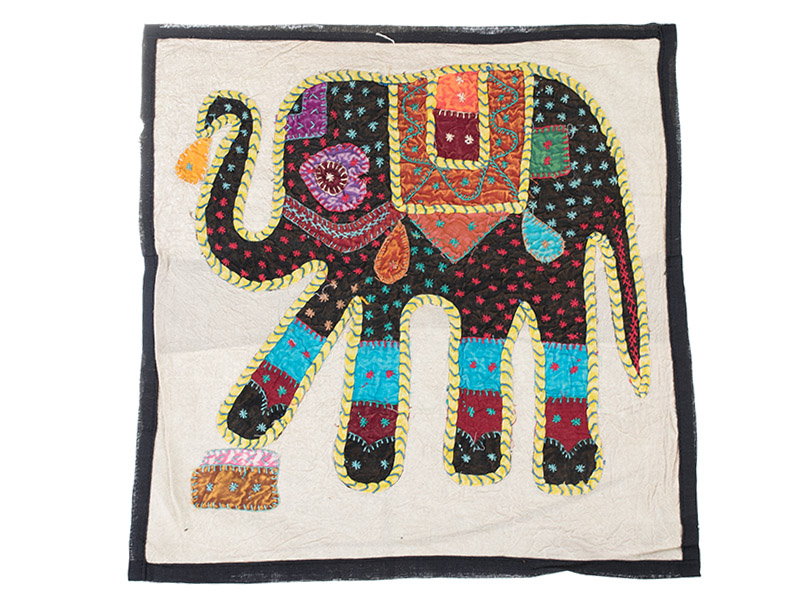 Velice pěkný, dekorační potah na polštář, v černé barvě ze zadní strany, byl vyroben v Indii ze 100% bavlny. Přední celá plocha potahu je ručně zdobená našitými barevnými látkovými aplikacemi, které tvoří motiv slona. Potah nemá zip, náplň se dovnitř pouze zasune.Polštář má tvar čtverce.