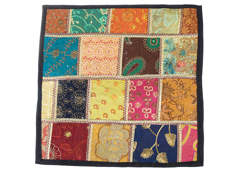 Velice pěkný, dekorační potah na polštář byl vyroben v Indii ze 100% viskózy. Přední celá plocha potahu je zpracována patchworkovou technikou z kousků barevných obdélníčků, kterou jsou pestře vyšívané a zdobené. Zadní strana je černá. Potah má zip. Polštář má tvar čtverce.
