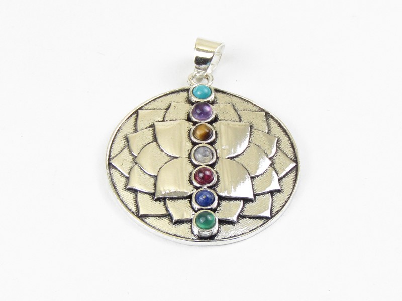 Kulatý přívěšek z obecného bílého kovu byl vyroben v Indii. Plocha kruhu je zdobená v motivu lotosového květu. Květ je dpodélně doplněn sedmi malými polodrahokamy v barvách čaker. Krásné plastické zpracování plného bílého kovového kruhu potěší všechny příznivce originálních šperků.