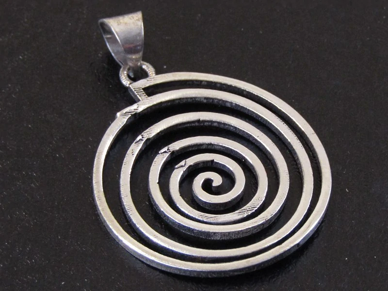 Přívěšek z obecného bílého kovu byl vyroben v Indii. Znázorňuje spirálu v kruhu.