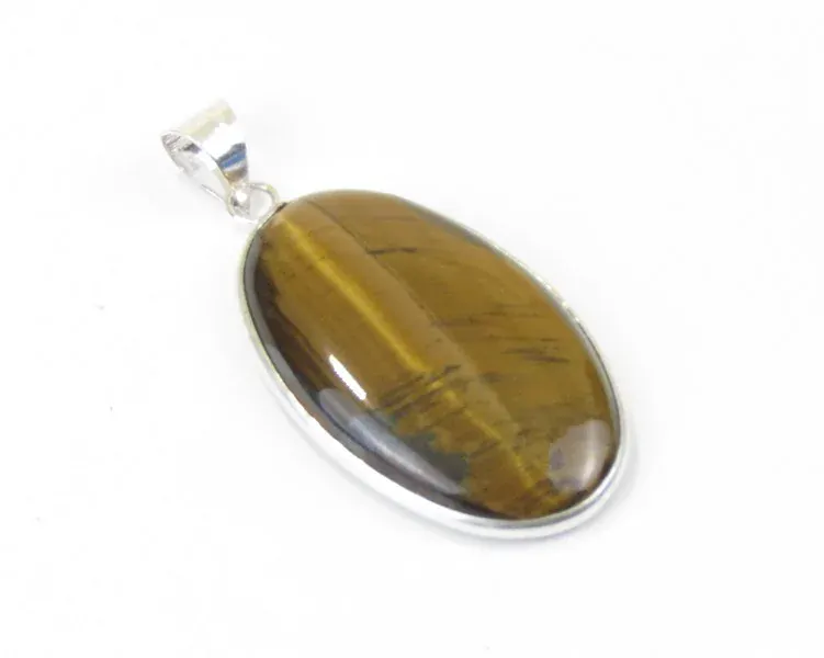 Překrásný oválný polodrahokam medově hnědé barvy - tygří oko je vsazen do bílého obecného kovu. Kov lemuje obvod kamene a horní část kovové části je doplněna očkem na protažení bavlnky. Bavlnka je součástí přívěšku. Bavlnka je kulatá, barvy černé a zavazuje se na uzlík.